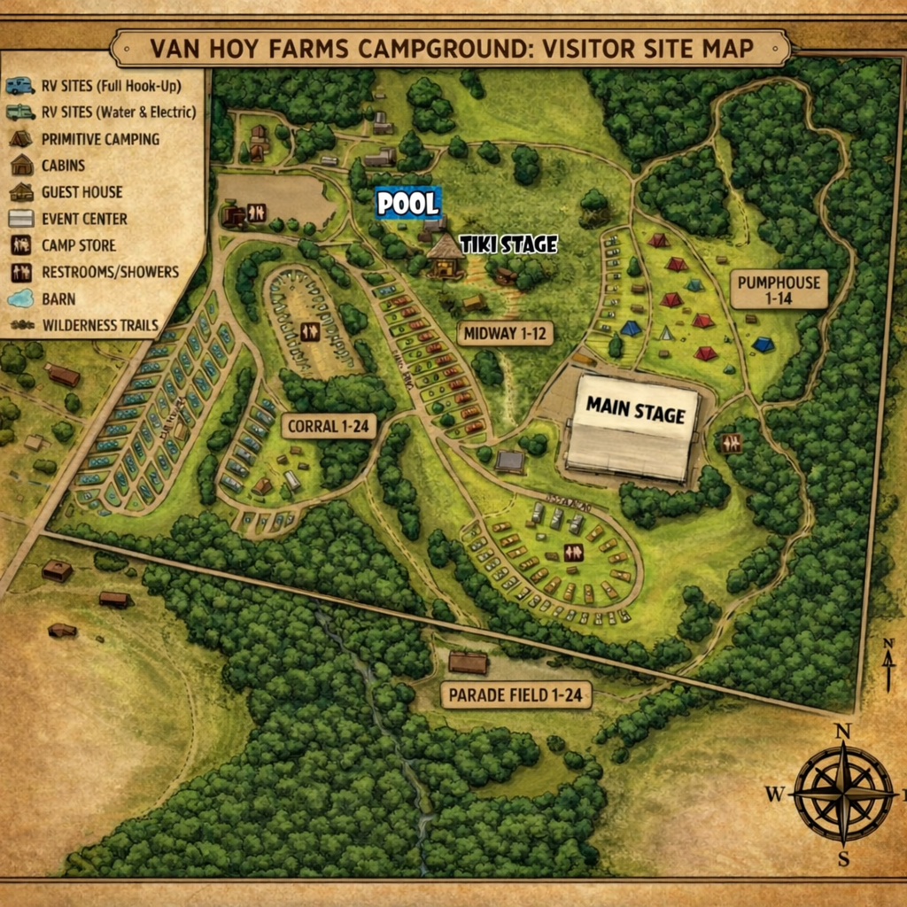 VanHoy Farms Family Campground offers over 100 rolling peaceful acres of land with full camping facilities and amenities. Sites are grassy with shady trees nearby. There are RV sites available with full water, electric and sewer hook ups .Go for a hike or wade through our stream. Grab a drink at the Tiki bar and listen to music on the TIKI BAR STAGE by the pool in the summer or attend one of the many special events at our larger MAIN ARENA STAGE. This venue is covered so rain or shine the show will be fine. An Amish village nearby offers breads, candies and fresh produce. We’re also close to apple and peach orchards. Come see why everything is better…”down on the farm!